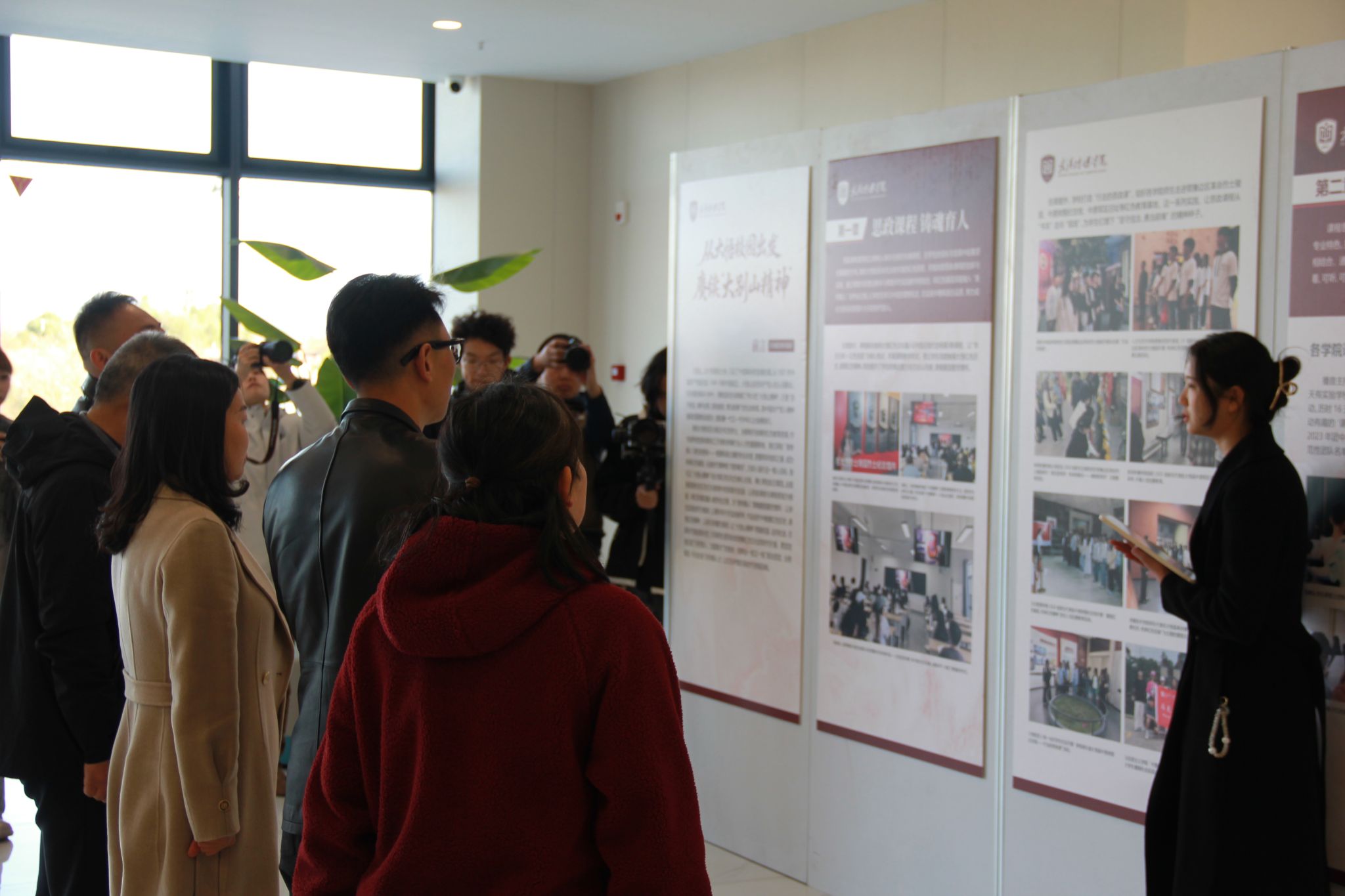 活动伊始,与会领导共同参观了位于校区图书馆一层的“从大悟出发——赓续大别山精神”主题展。该展览由校党委宣传部深度策划内容、设计学院倾力打造空间,以“课程铸魂、实践创作、社会传播”为清晰脉络,全面展现学校在红色文化教育中的探索与实践。在“思政课程 铸魂育人”板块,“课堂教学+实践研学”的双轨模式格外引人注目,其中依托大悟红色遗址开发的实践课程,生动展现思政教育从书本走向现场、从理论落地实践的创新路径;“课程思政 融合共进”板块聚焦各学院专业特色,呈现挖掘大悟红色元素、实现“学专业、传红色、育新人”的融合实践;“弘扬成果 精神远扬”板块则重点记录了学校联合大悟县人民政府与兄弟院校,推动红色文化成果从“校园创作”走向“社会传播”的坚实步伐。整场展览以“红色传承·青春担当”为核心,引导师生更深刻地理解红色文化的时代价值,更坚定地扛起“为党育人、为国育才”的使命,培养出一批又一批“政治坚定、业务精湛、作风优良”的传媒人才,让红色声音在新时代持续回响。