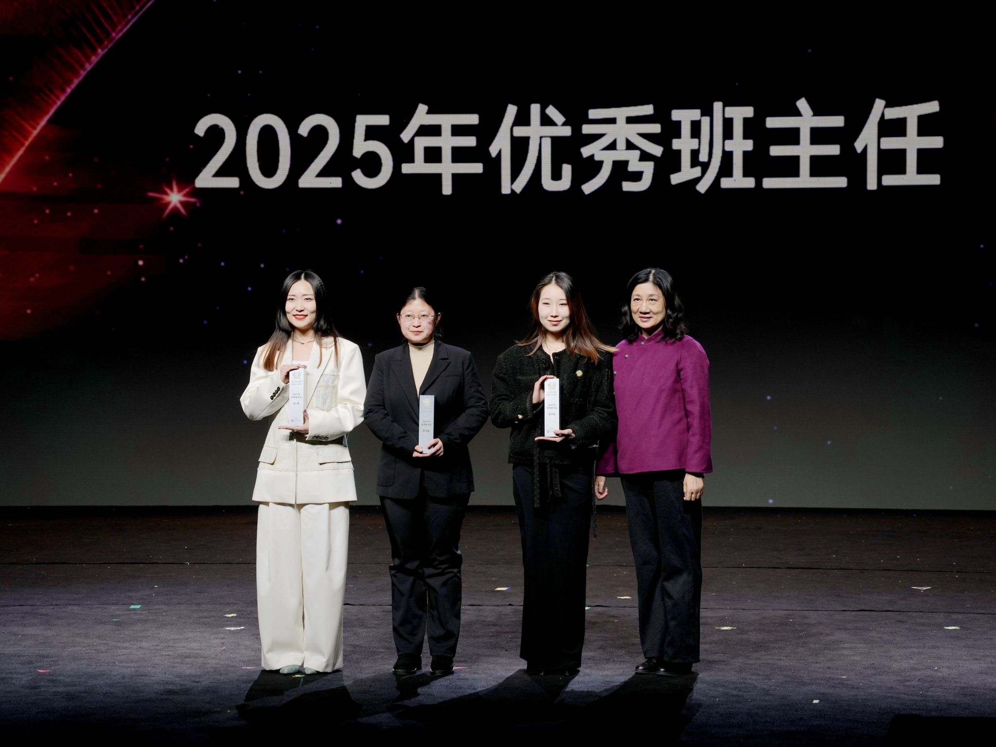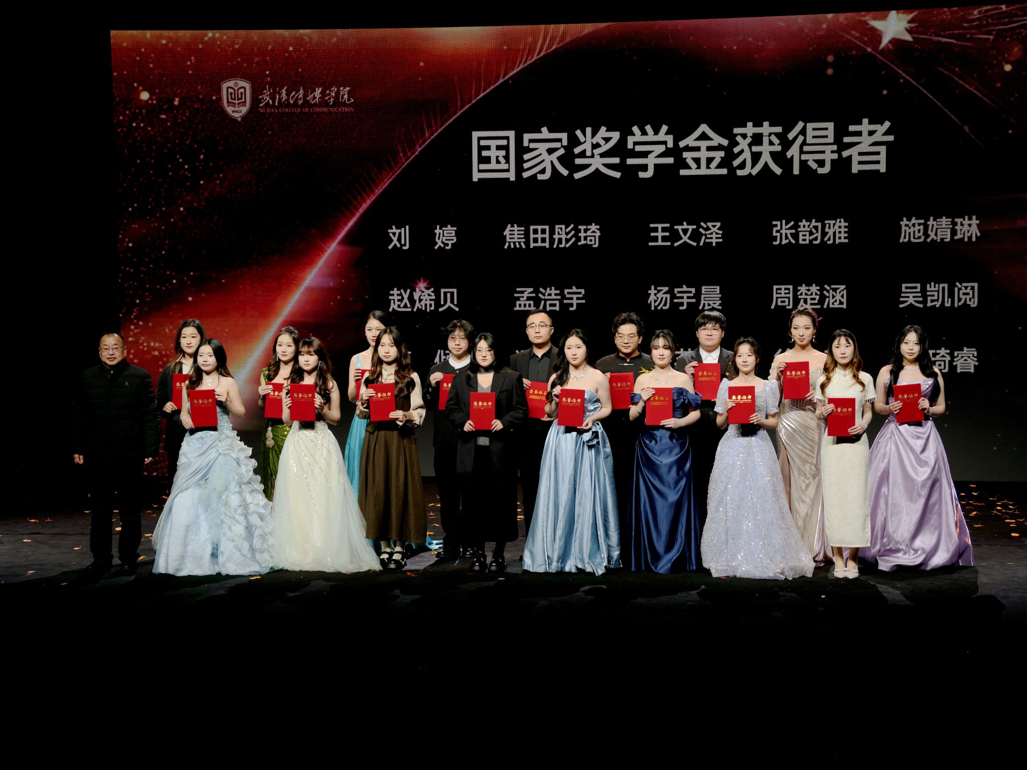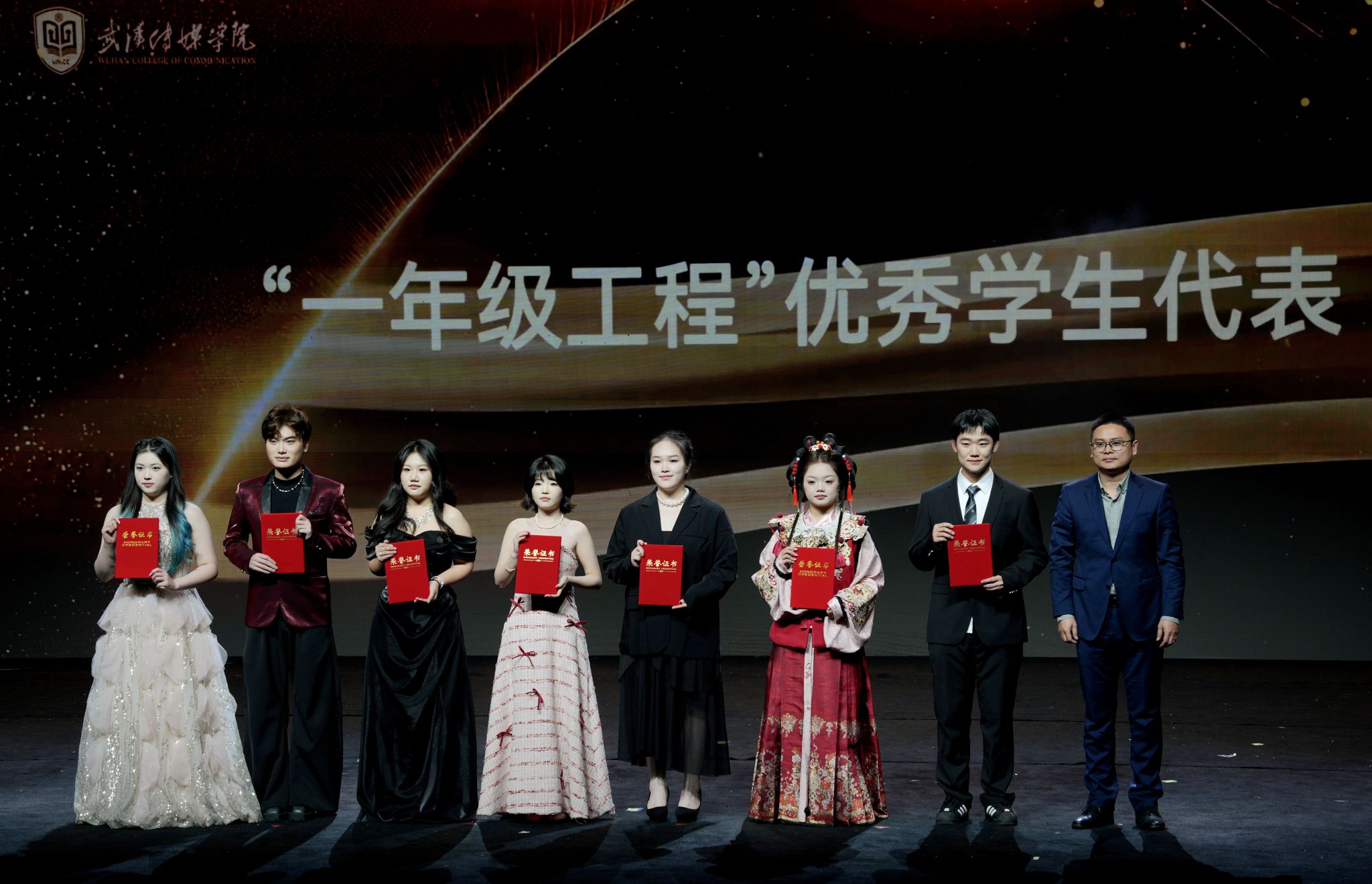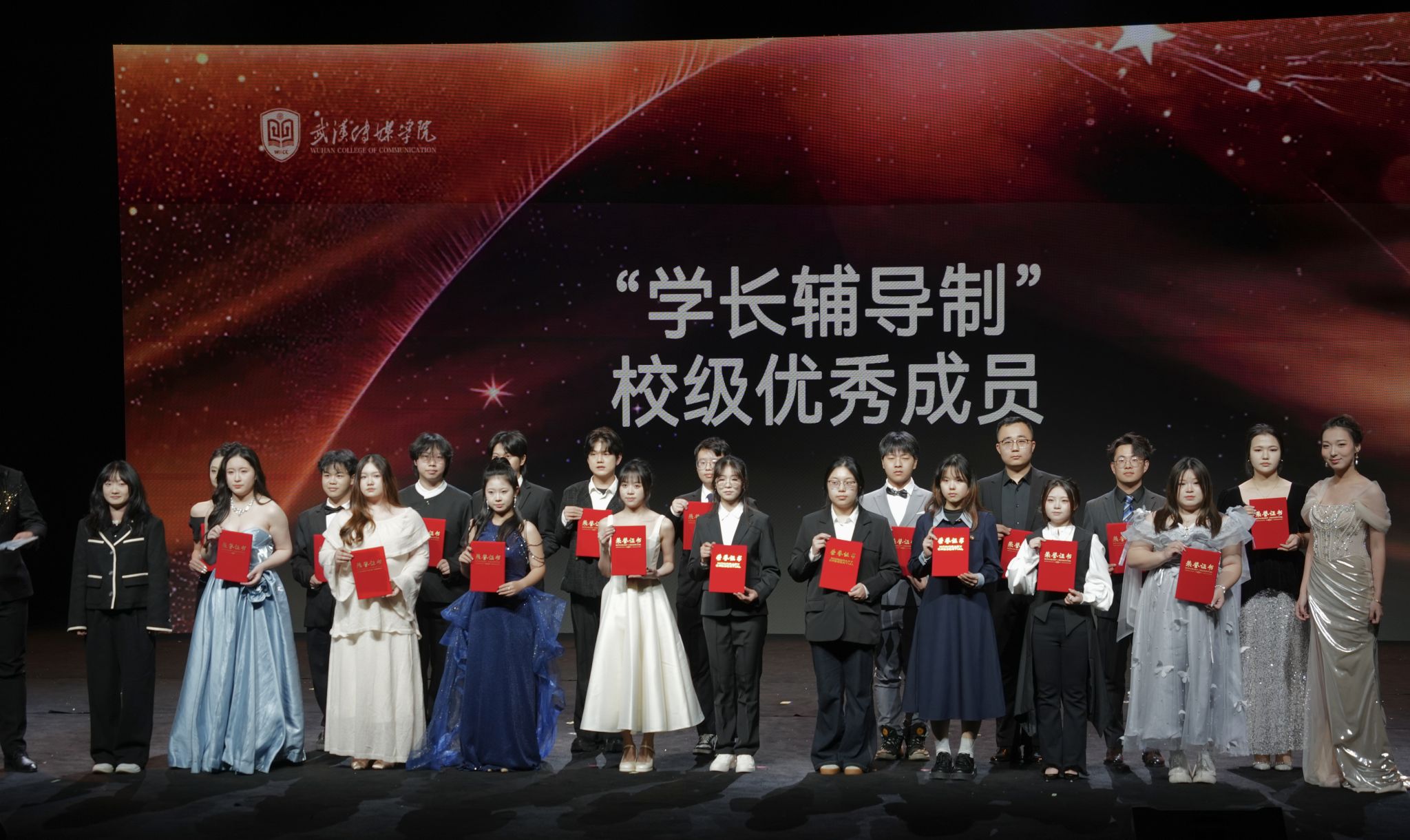 盛典伊始,星光红毯环节温情启幕。获奖师生代表身着正装踏光而来,步履从容、意气风发,尽显武传学子向阳而生的精神风貌,快门声响与掌声阵阵交织,定格下一个个荣耀闪光的瞬间。本次表彰覆盖面广、含金量足,囊括校级 “学长辅导制” 优秀成员、校级优秀团学组织及学生干部、“一年级工程” 先进集体与个人、2024-2025 学年优良学风班、优秀辅导员、优秀班主任,以及校长奖学金、国家奖学金获得者等多个类别,全方位展现学校立德树人各环节的亮眼成果与育人实效。