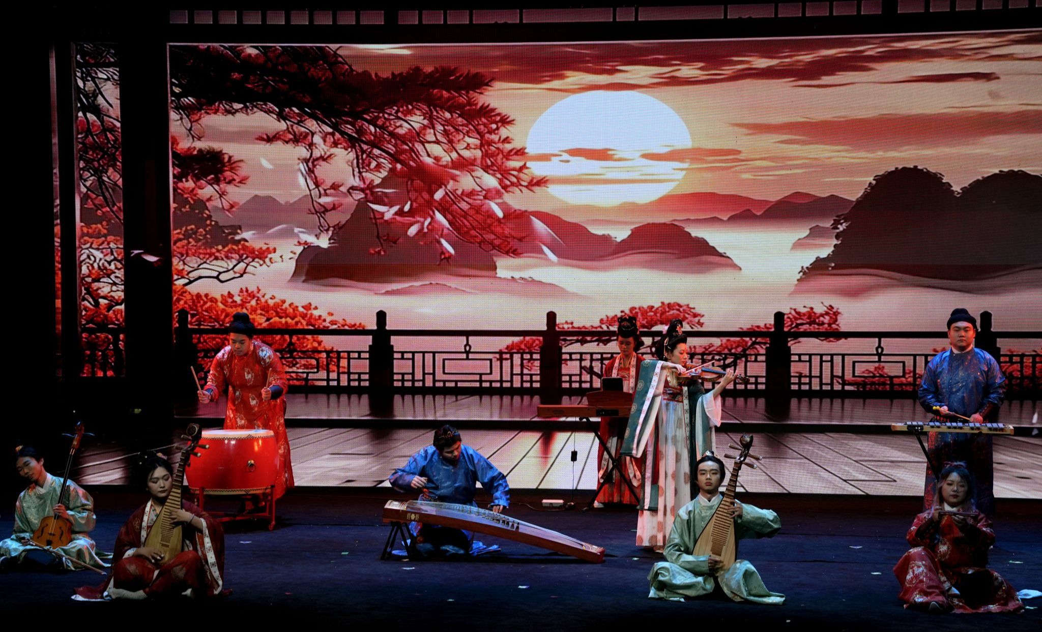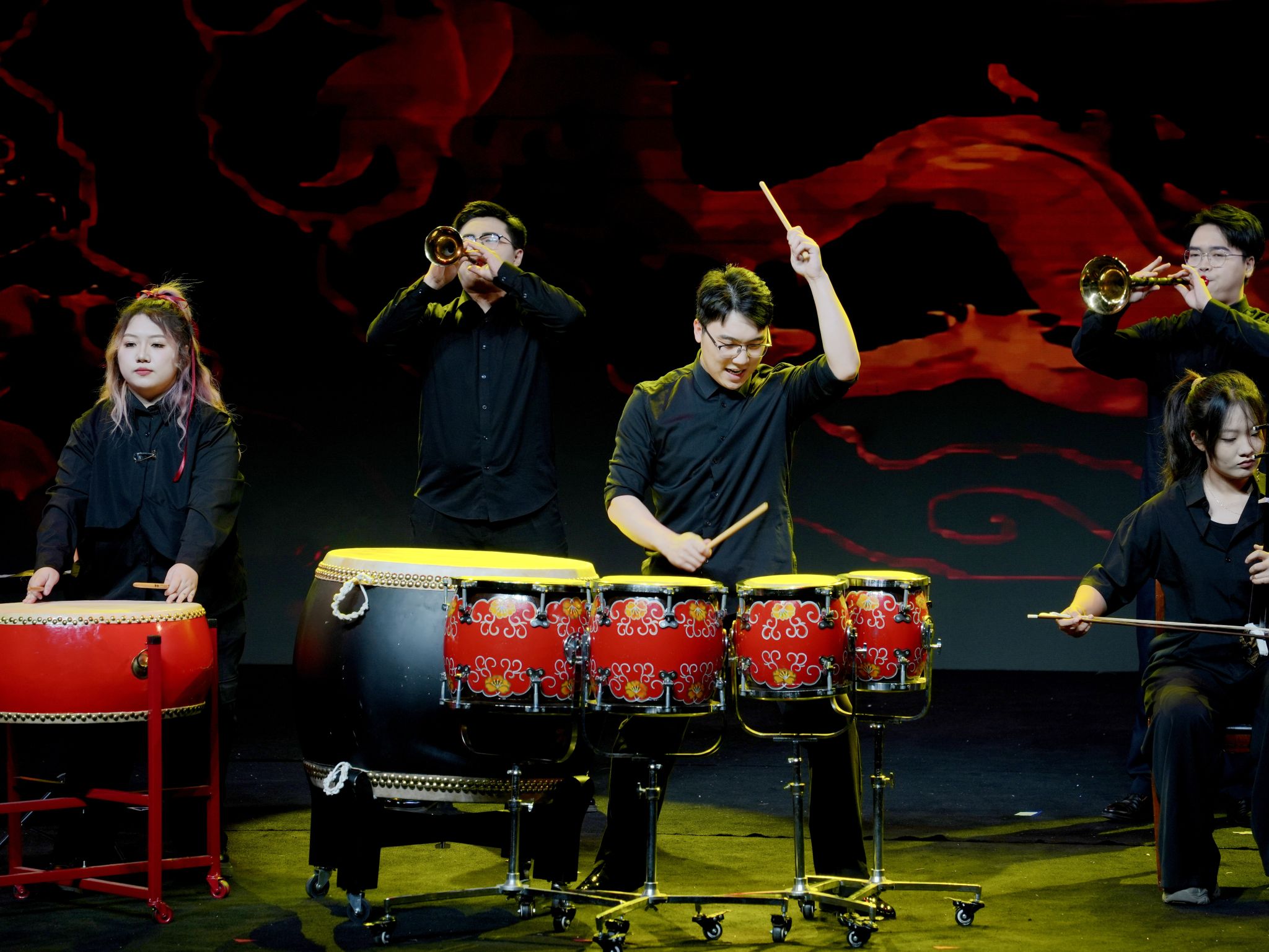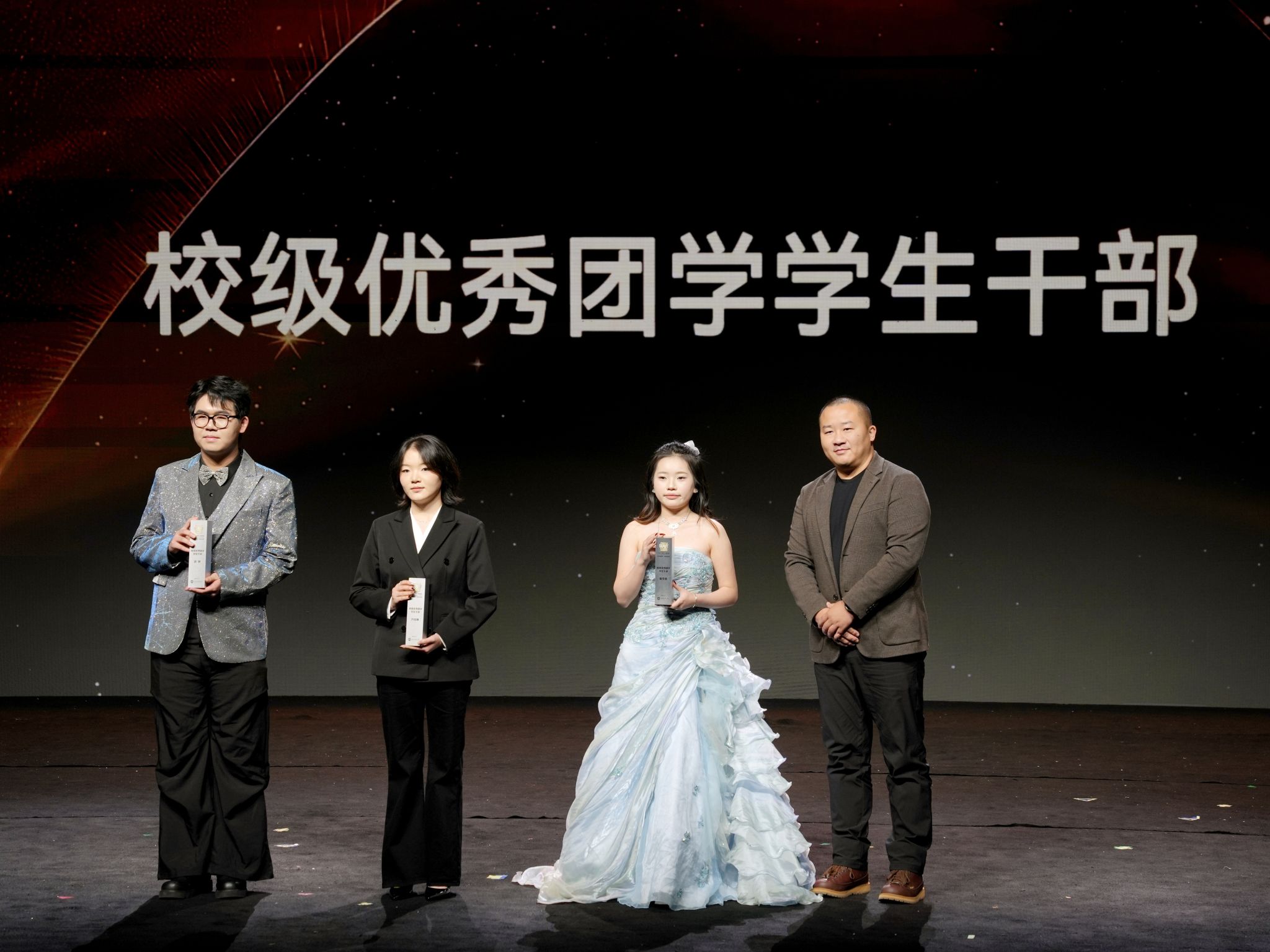 盛典现场,文艺表演与颁奖环节有序交替、相得益彰,在庄重的表彰氛围中融入青春朝气与文化底蕴,让榜样力量与艺术魅力同频共振。刚劲利落的开场舞《拳掌形意间》,以少年锐气点燃全场热情;微短剧《优秀你我他》聚焦国奖竞评现场,生动还原学子勤学笃行、互助共进的逐梦之路,引发全场共鸣;原创室内乐《乾卦西倾・隙光》融东方哲思与现代乐律于一体,诠释传统文化的创新表达;朗诵《我们在荒岛迎接黎明》字字铿锵,诉说青年坚守初心、向阳寻光的成长感悟,直抵人心;激昂的鼓乐演奏《龙腾虎跃》,奏响同心聚力、奋楫争先的时代强音;灵动的群舞《自古银杏不负秋》,将岁月敬意与尊师感恩之情融入翩跹舞步,温情动人。