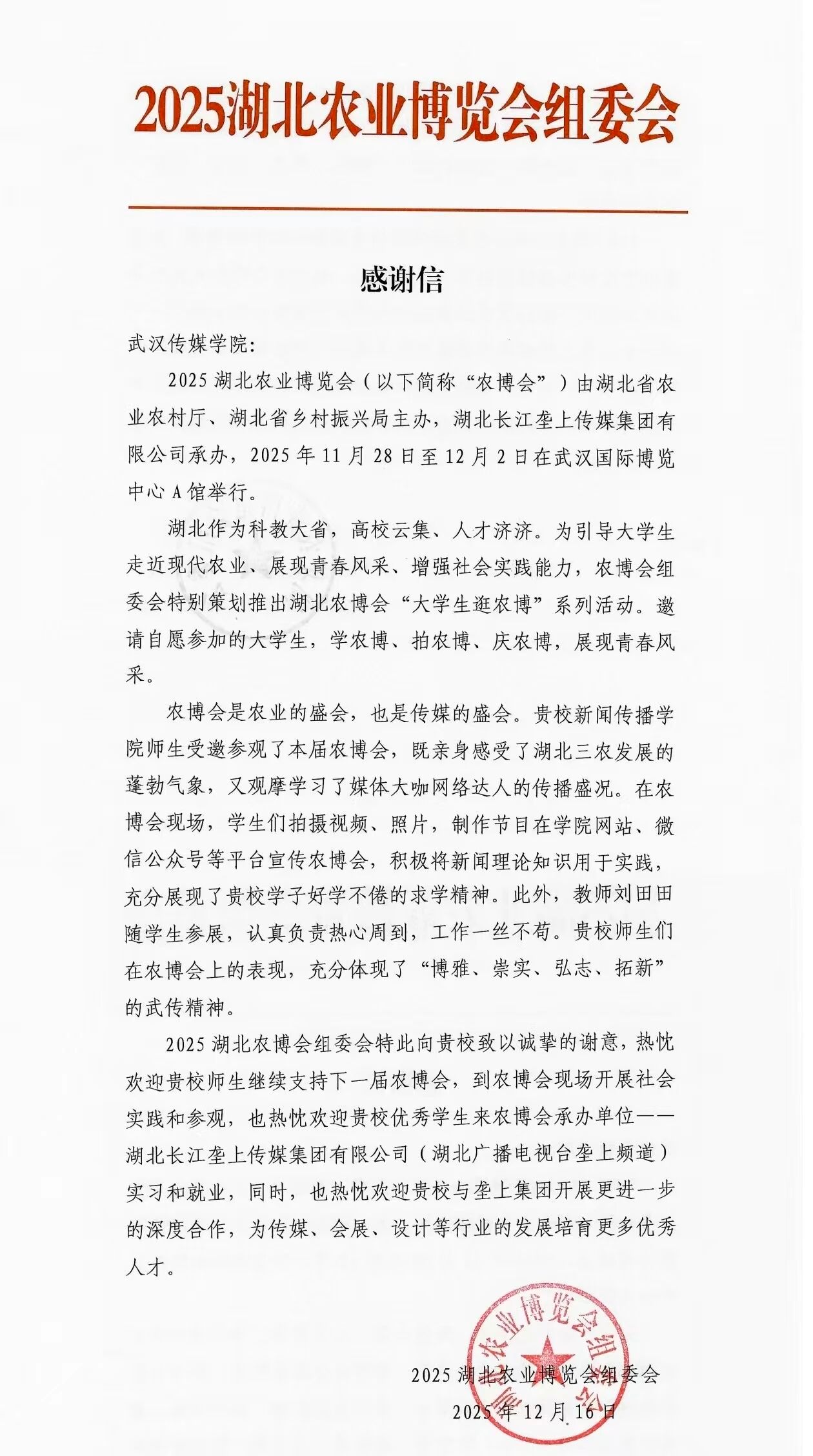 农博会组委会在感谢信中对武传师生的表现给予高度评价,既诚挚致谢,也发出持续合作邀约:邀请师生参与下一届农博会,欢迎优秀学子到承办单位湖北长江垄上传媒集团实习就业,期待双方深化合作,为传媒、会展行业培育更多优质人才。