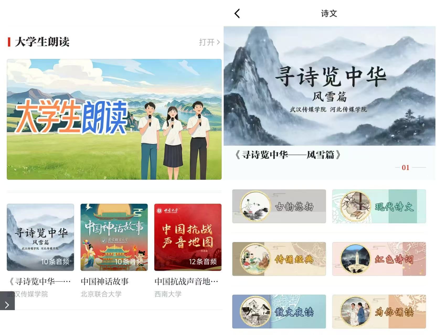 近日,我校播音主持艺术学院携手河北传媒学院精心创作的音频合辑《寻诗览中华 —— 风雪篇》,成功获 “学习强国” 平台关注转载,并在“热播""诗文”“大学生朗读”等板块首页推荐。作品以专业的有声表达传承中华诗词文脉,生动展现新时代传媒学子的文化担当与专业艺术素养,这也是我校广播类作品继去年获中宣部“学习强国”平台好评后,在文化传播与专业实践领域取得的又一亮眼成果。
