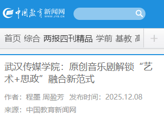 中国教育报-中国教育新闻网讯(记者 程墨 通讯员 周盈芳)为纪念中国人民抗日战争暨世界反法西斯战争胜利80周年,推动思政教育与专业教育深度融合,近日,武汉传媒学院原创音乐剧《武汉·1938:大家唱》精彩上演。该剧以1938年武汉抗战歌咏运动为历史底色,以“艺术+思政”为创作内核,以舞台传递不朽的抗战精神,为大学生呈现了一场兼具历史厚重感与艺术感染力的沉浸式思政盛宴。