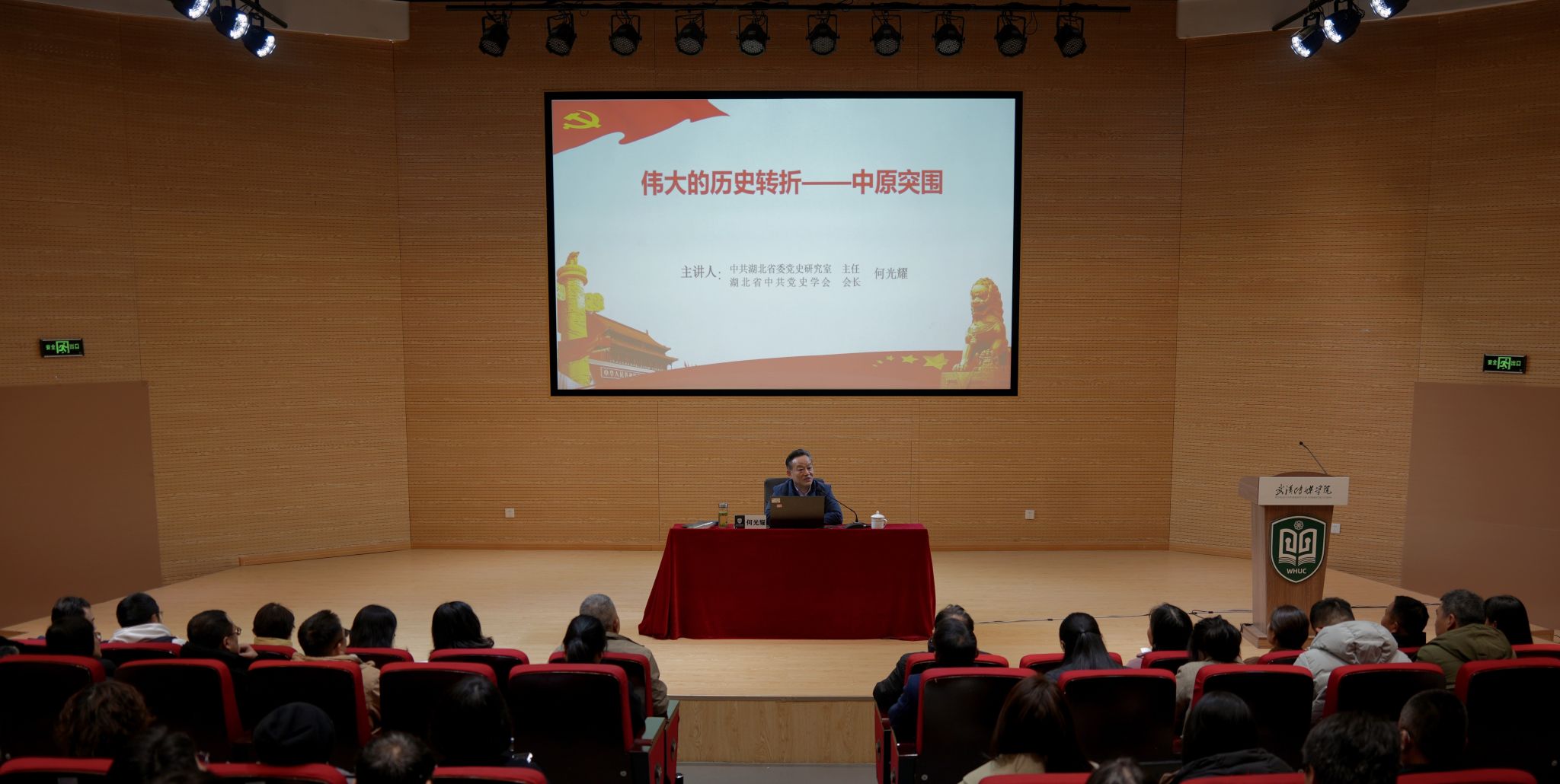 (记者 周盈芳 摄影 邵叙源)为深入学习贯彻党的二十届四中全会精神、省委十二届十一次全会精神及习近平总书记关于党史学习教育的重要论述,传承红色基因、赓续红色血脉,推动党史学习教育与专业建设深度融合,12月18日下午,我校在圆形报告厅隆重举办中原突围党史学习教育宣讲会。湖北省政协文化文史和学习委员会副主任、知名党史专家何光耀受邀担任主讲,学校全体党员干部、骨干教师等120余人参加此次会议。