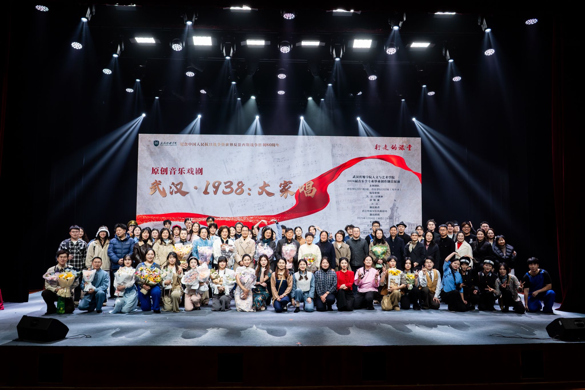 (记者 安步清)为纪念中国人民抗日战争暨世界反法西斯战争胜利80周年,深入推进思政教育与专业教育深度融合,12月4日晚,由党委宣传部、党委组织部指导,人文与艺术学院承办的原创音乐戏剧《武汉·1938:大家唱》在凤凰演播厅精彩上演。该剧由沈洁老师担任总导演,孙赛赛老师联合指导,2026届音乐学专业毕业生共同参与创作与演出,既是一场致敬历史的艺术盛宴,更是一堂沉浸式的思政大课,生动诠释了“艺术+历史+思政”的融合育人成果,让红色精神在新时代焕发出蓬勃生机。