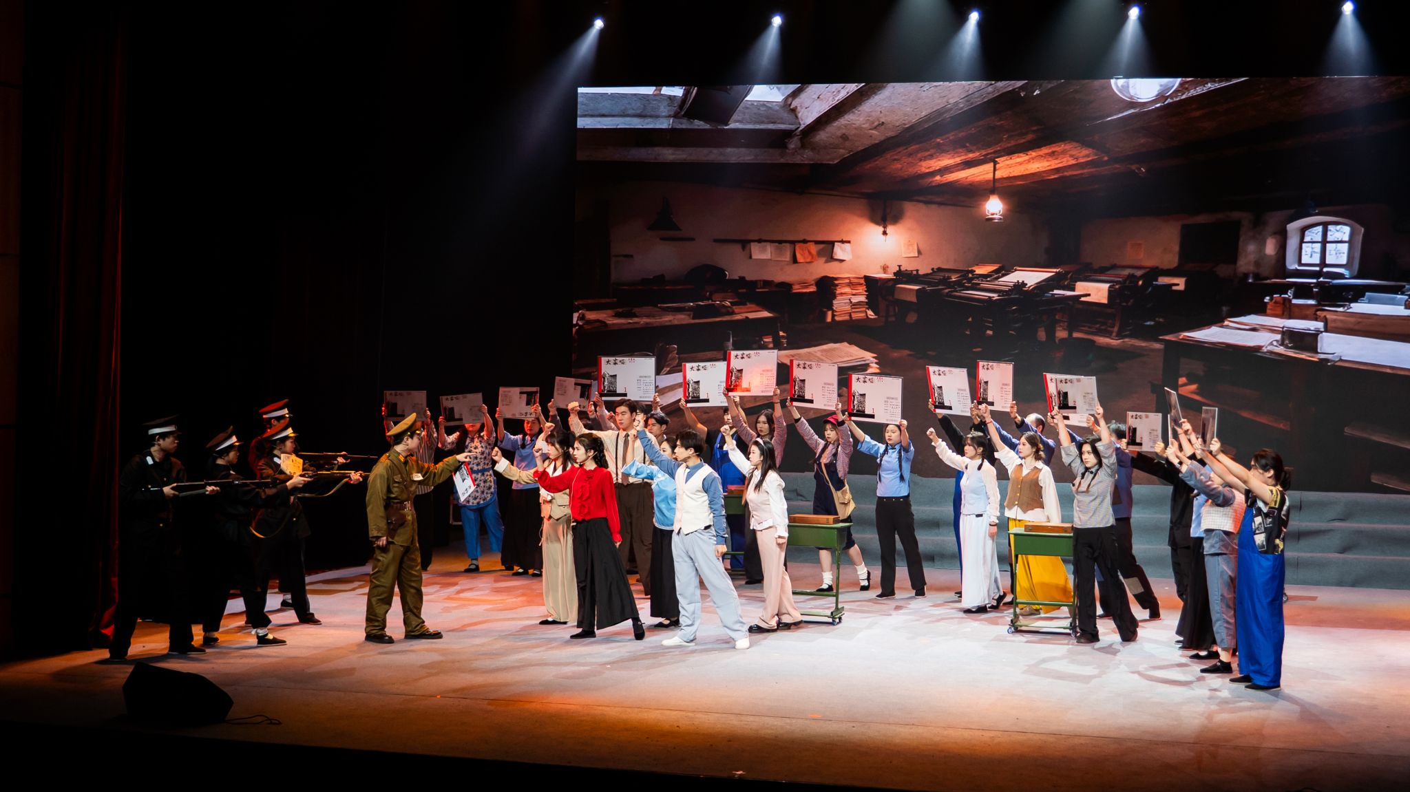 第三幕“江城战歌” 聚焦危机时刻,工人秘密赶印《大家唱》时遇张督察搜查,何梅英与众人机智周旋保全歌单;歌单由报童分发遭拦截,何梅英挺身而出痛斥汉奸不幸被捕,现场响起《打倒汉奸》的怒吼。