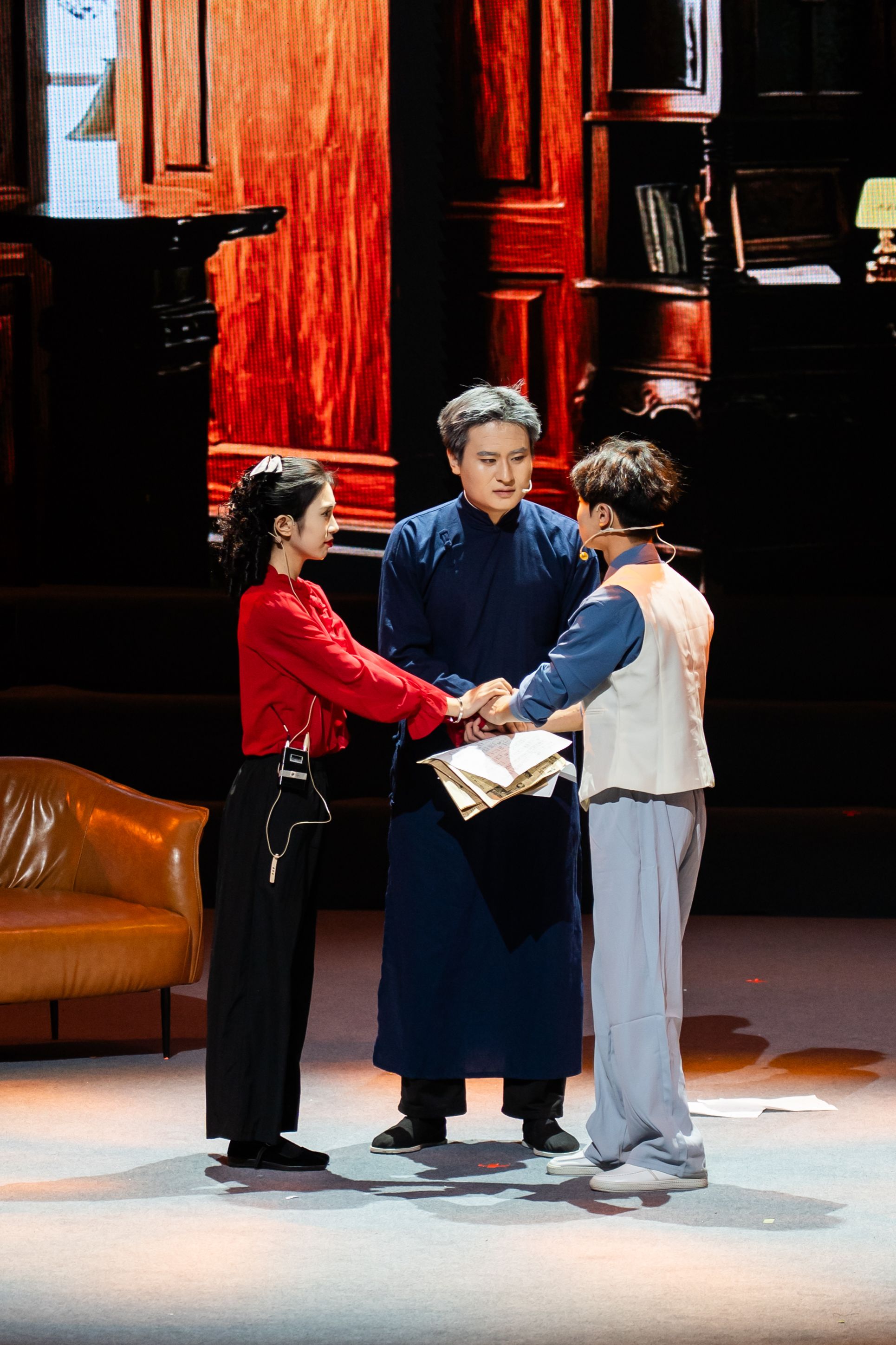 第二幕“家国赤忱”里,曾昭正欲投身救亡运动,其父曾厚诚初忧家族产业,经子女与何梅英动情劝说,终以捐资支持彰显商人赤子心;众人在冼星海指导下缝制棉衣、高唱《做棉衣》,为解歌谱匮乏难题,曾昭正提议编印歌集,潘琪定名《大家唱》,让抗战歌咏有了统一载体。